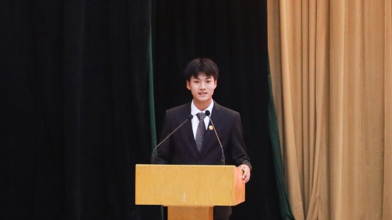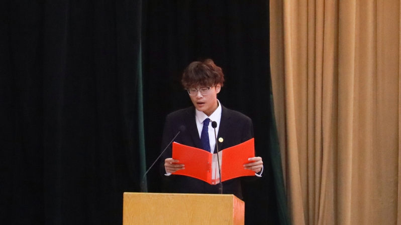 自动2504班成垣杉代表全体新生发言。他回顾了填报高考志愿时的笃定与向往,表达了入学报到时的激动与期待,憧憬了未来大学生活的精彩与挑战,表示要以奋斗回应时代之问,以青春融入国家发展浪潮,用所学所长为强国建设添砖加瓦,让青春在民族复兴征程中绽放光彩。