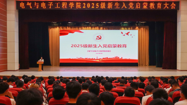 为引导广大新生端正入党动机,提高思想觉悟,坚定理想信念,9月28日下午,电气与电子工程学院于大学生艺术中心礼堂召开2025级新生入党启蒙教育报告会。报告会由学院党委书记卢彦峰主讲,全体辅导员、2025级全体新生参加。院党委副书记王潇伟主持报告会。