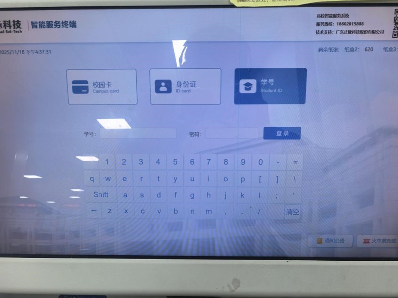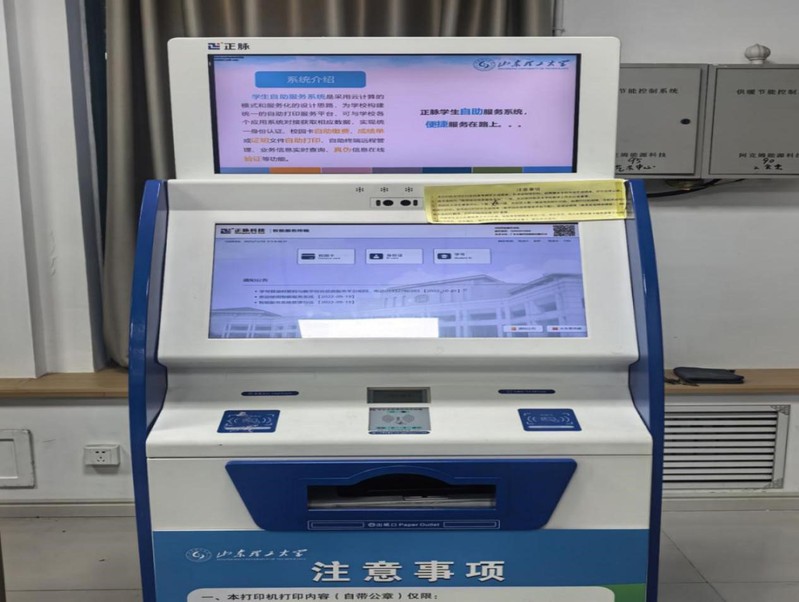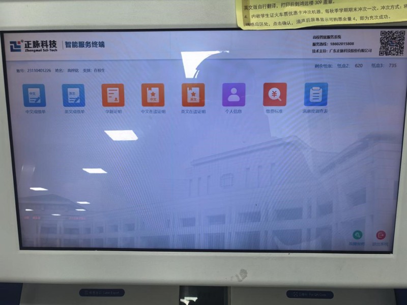 台自助打印机上,持校园卡打印中英文成绩单、中英文在读证明、学籍证明等。具体流程和示例如下图所示。