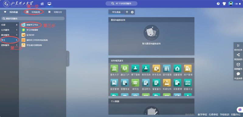 3.点击“可用应用”,点击“学工”,点击“新版学工平台”进入系统。