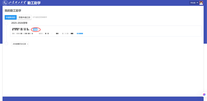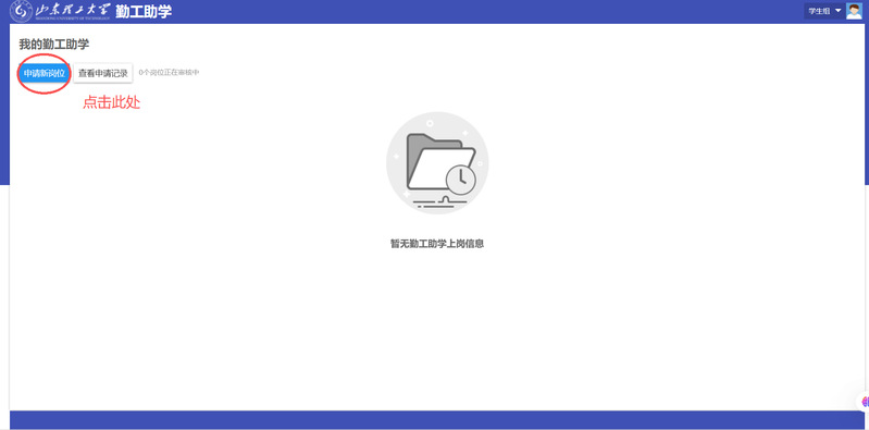 1.点击“我的勤工助学”跳转界面后,点击“申请新岗位”。