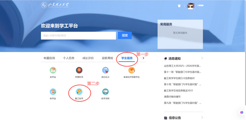 4.点击“学生服务”后,选中“勤工助学”板块。