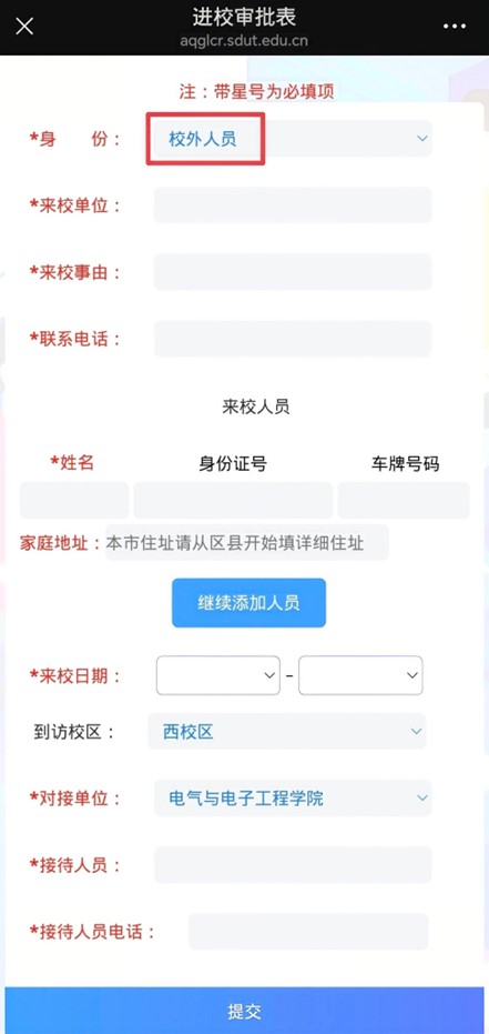 注:身份选“校外人员”,来校事由要详细具体,对接单位选“电气与电子工程学院”,接待人员填辅导员姓名,接待人员电话填辅导员的电话。