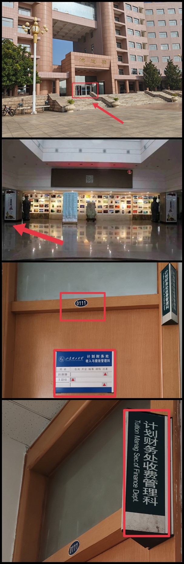 2.线下方式:鸿远楼一楼西侧计划财务处收费管理科0111室(从大门进去后左拐即可),如图: