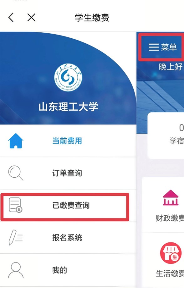 (1)用山东理工大学app缴费完成后,点击“菜单”后点击“已缴费查询”