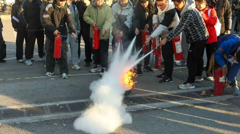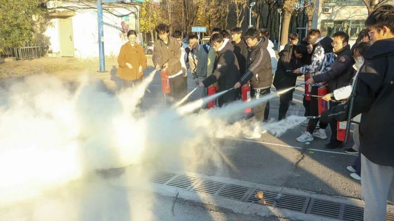 演练现场讲解了干粉灭火器的正确操作步骤——提瓶、拔销、握管、压柄,并强调了站在上风口、对准火焰根部喷射等关键要点。在认真观摩后,学生在专家的专业指导下,针对模拟火源进行了灭火器实操演练。