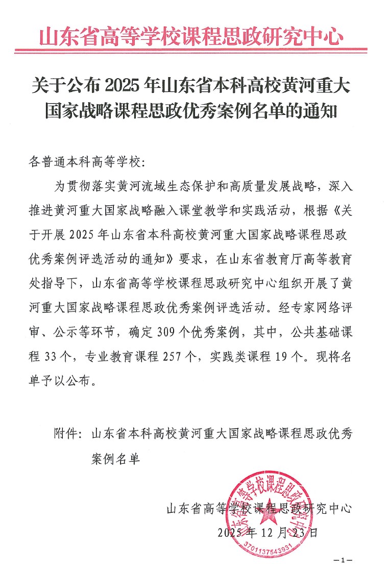 近日,山东省高等学校课程思政研究中心公布了2025年山东省本科高校黄河重大国家战略课程思政优秀案例评选结果。经专家评审,全省共确定309个优秀案例,我校获批8项,其中我院教师张厚升申报的《以控制系统的稳定与智能,守护黄河安澜与区域发展——“闭环系统控制性能分析”课程思政教学设计》教学案例成功入选。
