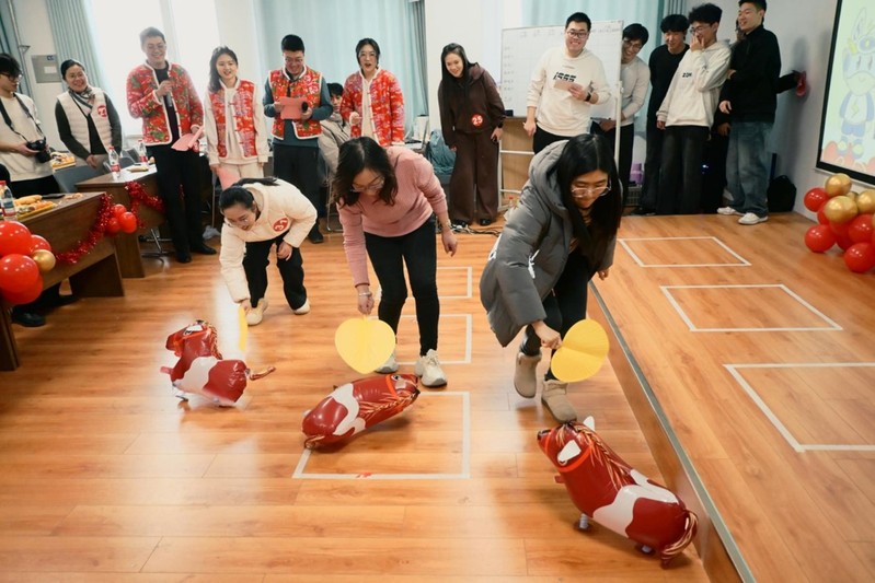 联欢会紧扣“马”年主题,趣味游戏与抽奖环节穿插放送。“马到成功”“蒙眼喝马酒”等个人项目妙趣横生;“背筐接球”“蒙眼喂食”等团队项目考验默契;而“桃花朵朵开”更将全场气氛推向“万马奔腾”的高潮。教职工踊跃参与,各展风采,现场掌声与欢笑此起彼伏,洋溢着一派欢乐祥和的迎新气氛。