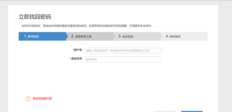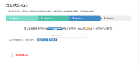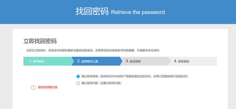 (2)按照四个步骤分别输入信息、验证邮箱或密保问题即可修改密码
