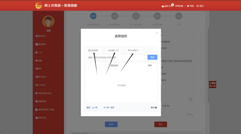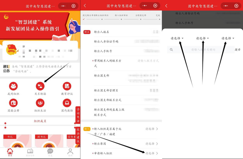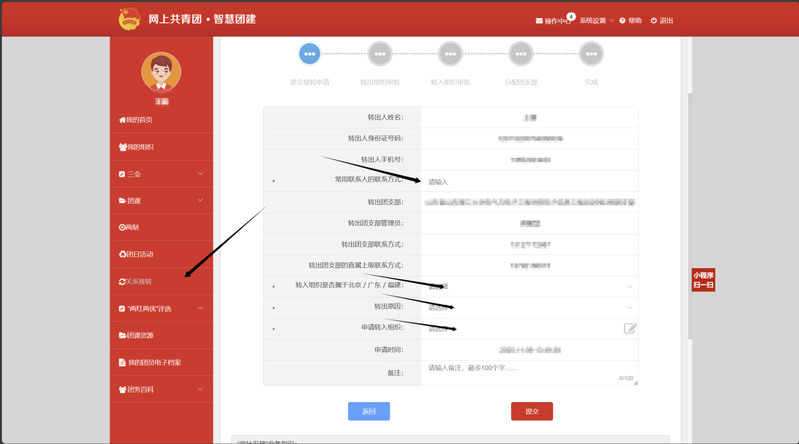 团员登录系统进入个人中心,点击左侧“关系转接”菜单,依次填写相应信息。