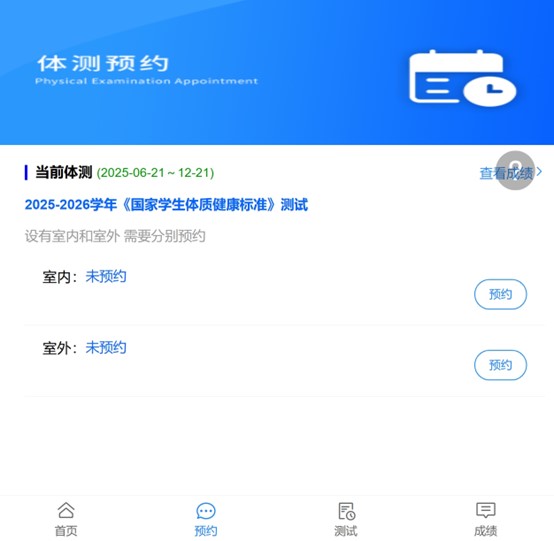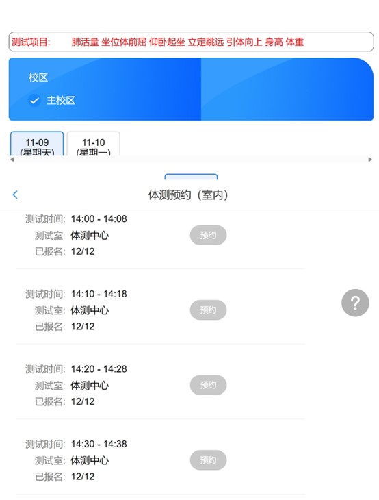 3、选择想要预约的项目,在规定的时间进行体测。体测分为室内与室外两部分,两部分都需要预约,室外体测实时关注体测通知,获悉场地情况。