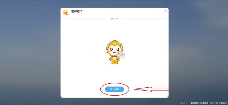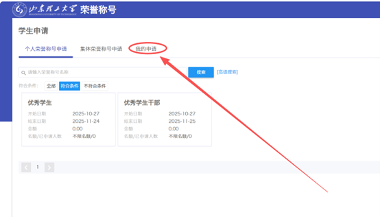 3.在“服务大厅”———“学工”——“学生服务”——“荣誉称号进入”——“我的申请”——“申请详情”里找到“证书打印”后,点击并进入服务。