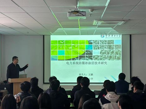 电网覆冰是威胁电力系统安全稳定运行的重大自然隐患,尤其在冬季寒冷潮湿地区,导线及绝缘子等设备上的覆冰可能导致线路舞动、闪络、甚至倒塔断线等严重事故,造成巨大的经济损失与社会影响。传统融冰、除冰方法如机械除冰、直流融冰等存在能耗高、效率有限或可能损伤设备等问题。因此,开发高效、持久、环境友好的主动预防性防覆冰技术已成为行业迫切需求。10月18日,我院邀请华北电力大学(保定)研究院副院长王鹏教授作研究报告《电力系统防覆冰涂层技术研究》。王鹏教授在报告中重点阐述了一种新型复合功能涂层的设计与应用。该涂层通过模仿自然界中荷叶等生物的超疏水特性,并结合材料表面能调控与微纳结构设计,实现了对冰晶附着的显著抑制。